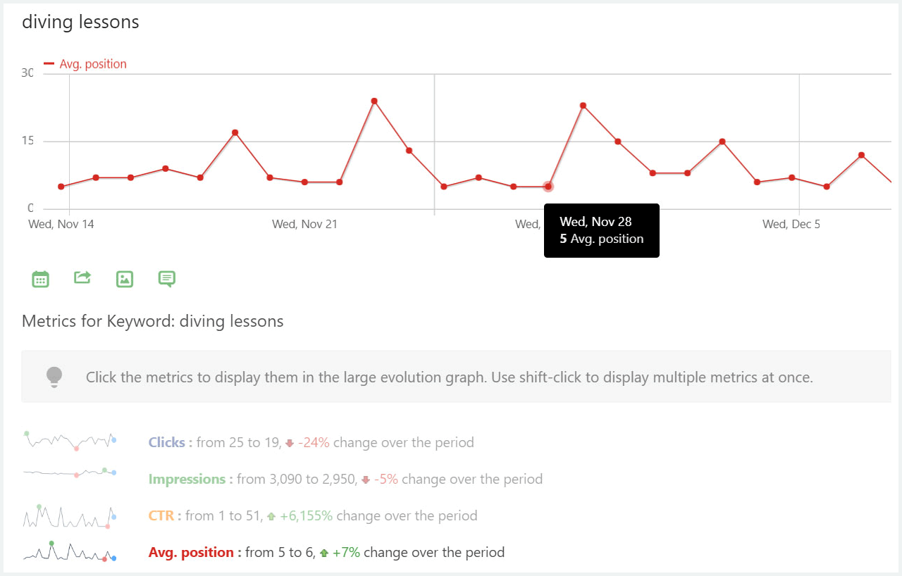Autre avantage de référencement majeur, vous pouvez voir comment le classement des mots-clés recherchés les plus importants pour votre activité varie au fil du temps.