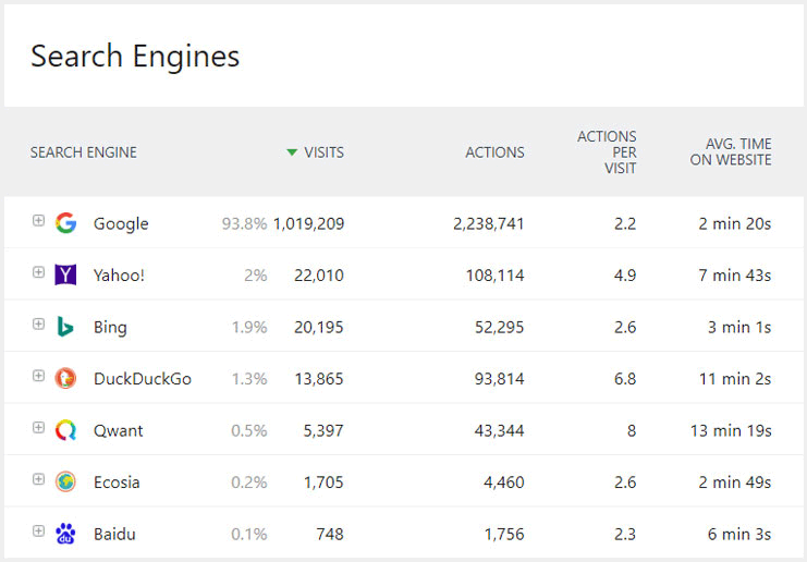 Matomo vous permet d’évaluer la performance des mots-clés sur Google, Bing et Yahoo lors de votre ascension vers la première position sur ces moteurs de recherche.