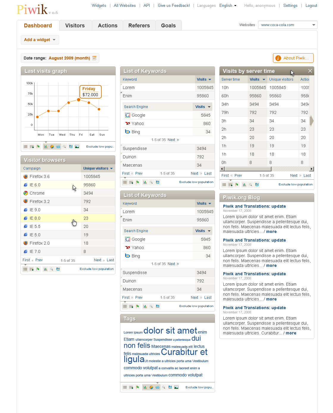 - New style for widgets: colors, the footer, and tables scrolling to the right when there is too much data to display. We tried to improve the widgets’ footer to make it easier to access the other reports that Matomo provides: Advanced view to show all columns, ‘Goals’ view to see conversions for each segment.