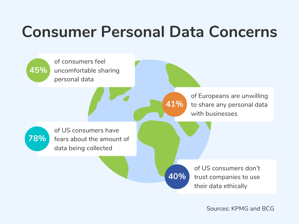 En moyenne, 45 % des consommateurs se sentent mal à l’aise à l’idée de partager leurs données personnelles. Selon KPMG, 78 % des consommateurs américains ont des craintes quant à la quantité de données recueillies. 40 % d’entre eux ne font pas non plus confiance aux entreprises pour utiliser leurs données de manière éthique. Parmi les Européens, 41 % ne sont pas disposés à partager leurs données personnelles avec les entreprises.