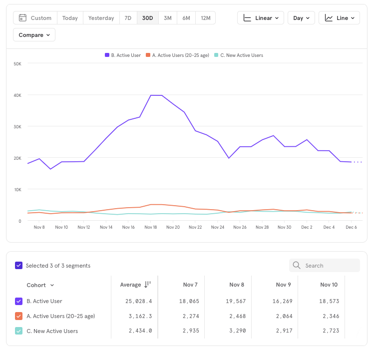 - Segment cohorts further based on additional criteria and compare multiple cohorts side-by-side.