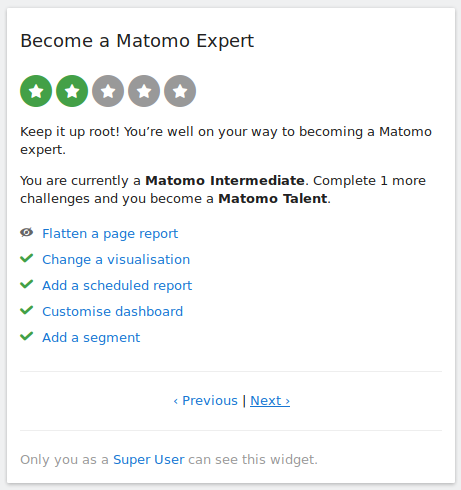 A new Matomo Tour feature was introduced, guiding you through the most common steps to learn Matomo and make the most of the product, such as creating Goals, uploading your custom logo, learn how to flatten a report, change a visualisation, create an email report, customise the dashboard, create a segment, and more. Complete all the challenges to learn all the tricks and become a Matomo pro!