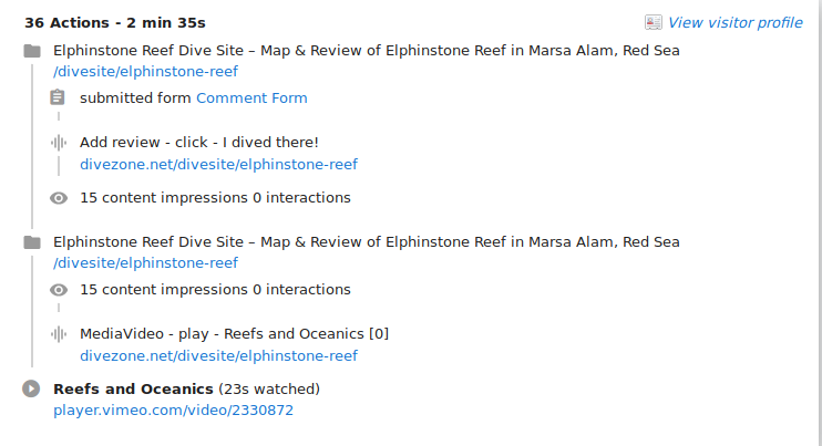 The Visits Log and Visitor Profile now display actions in a more readable and efficient way. When you’re tracking events, tracking file downloads, or using content tracking, or tracking videos, tracking forms, etc. your actions are now grouped together under the page in which they occurred, making it very easy to see where events occured. There are also other smaller improvements to the visitor log (showing all ecommerce product categories, etc.).