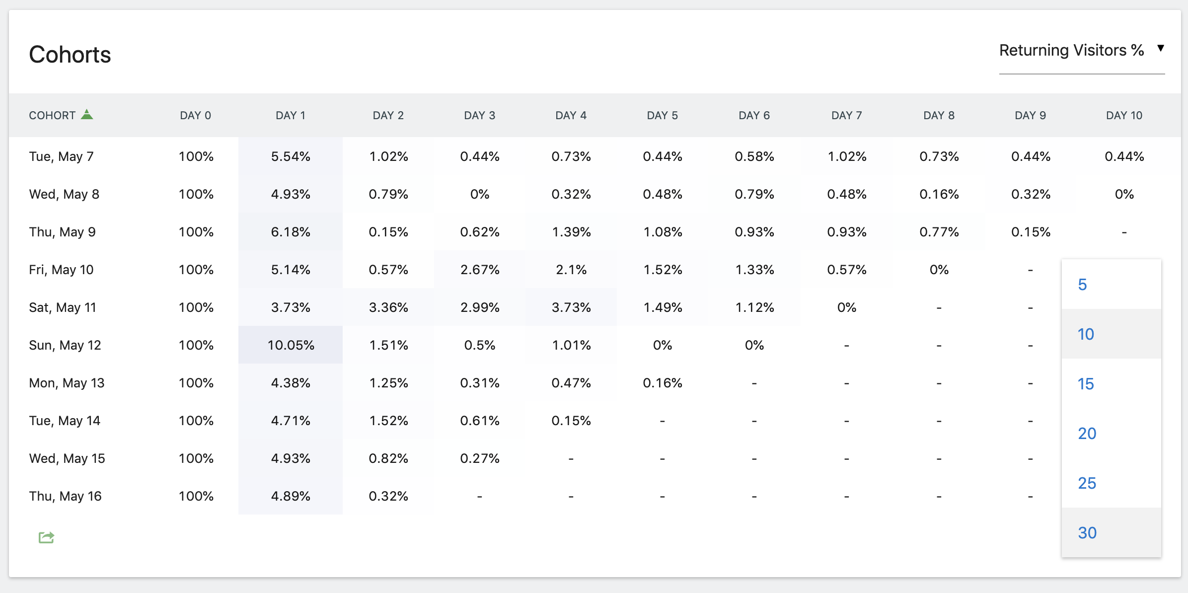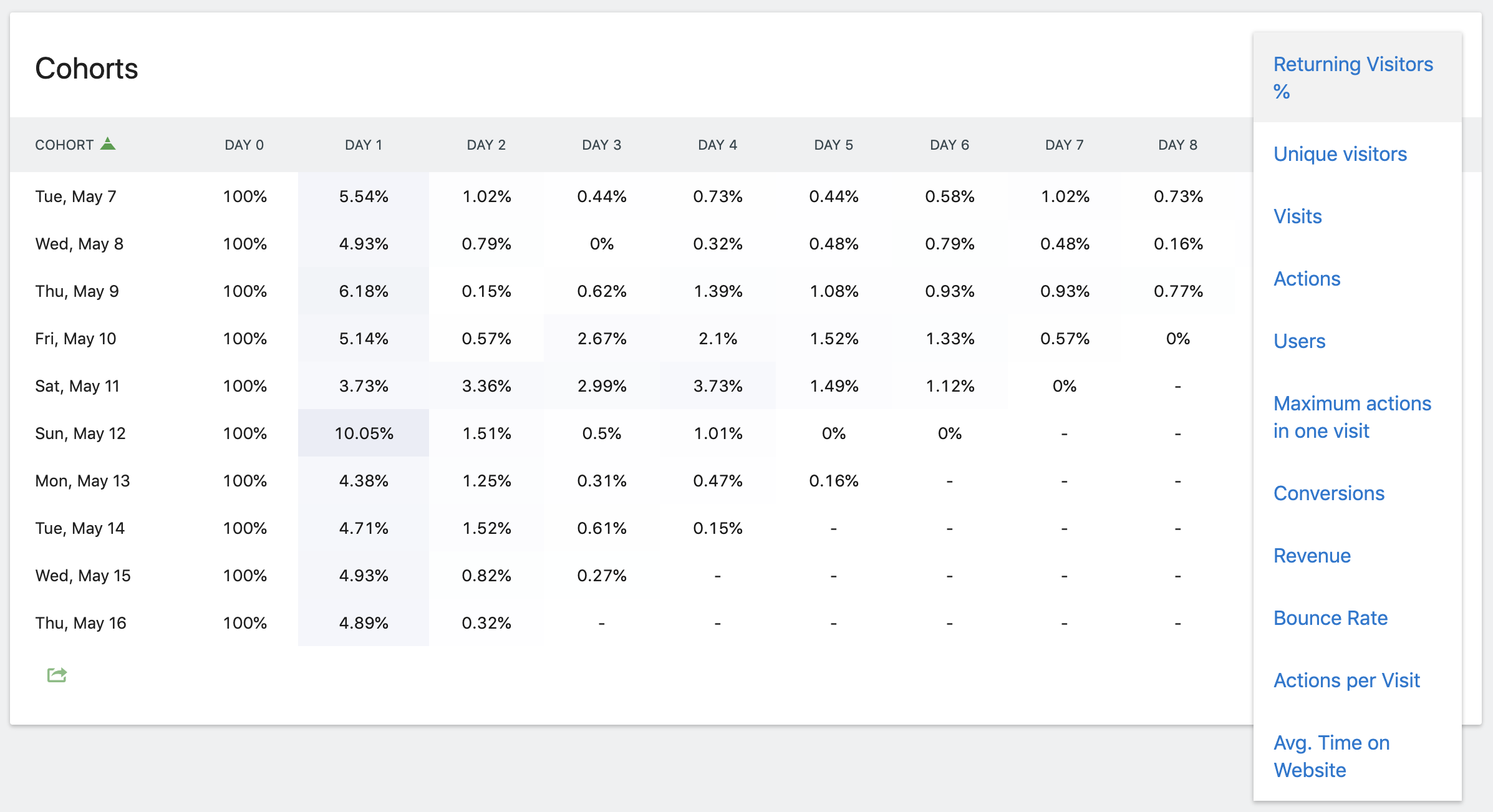 By default, the metric displayed is « Returning Visitors % », which is the percent of visitors in the cohort that visited again for the column. This metric can be used to see when users stop visiting your website.