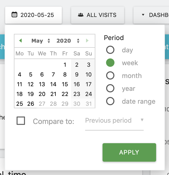 To view cohorts in week, month or year periods, simply select that type of period in the period selector: