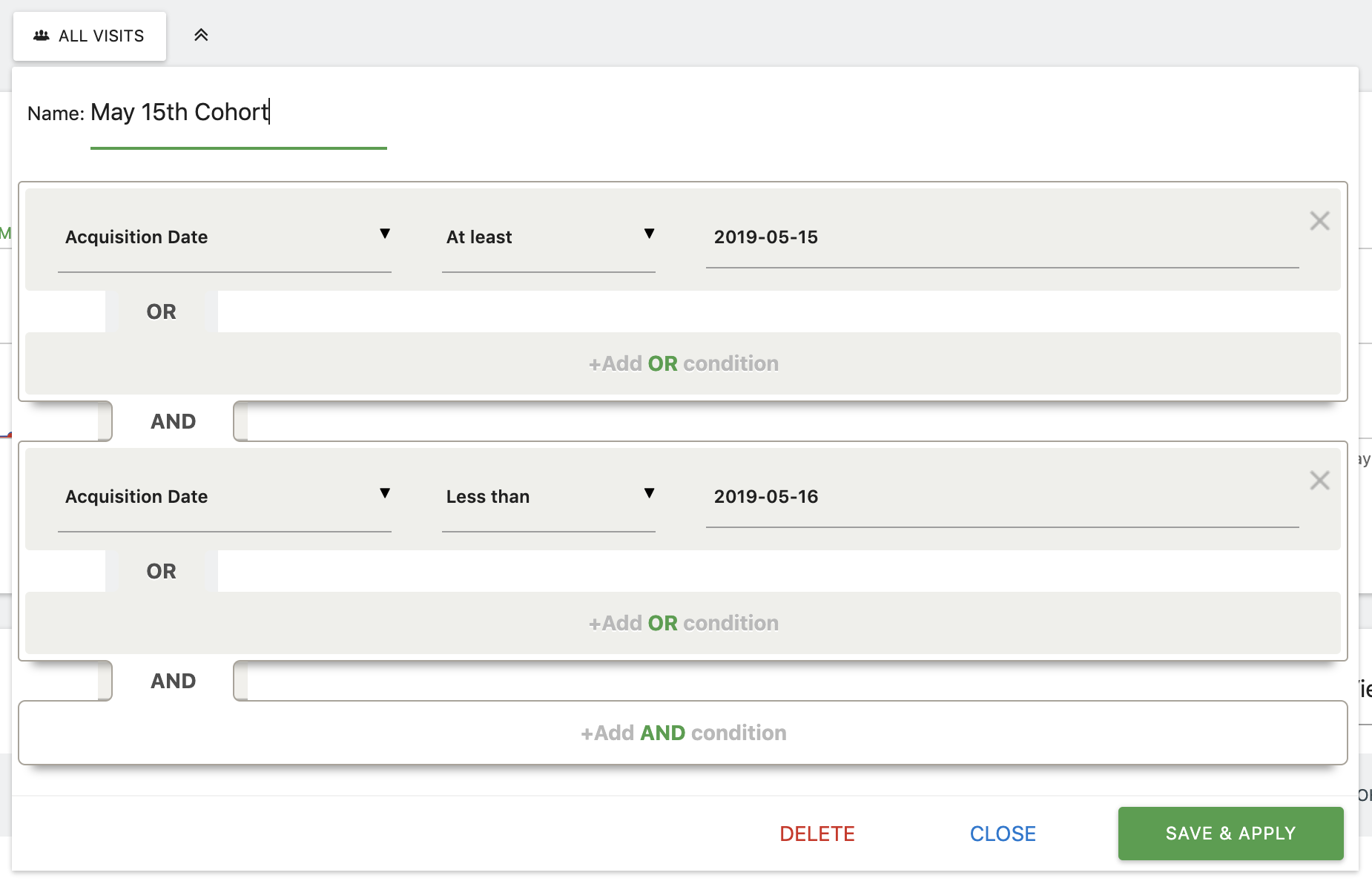 In the above example, we’re creating a segment that allows us to look at reports for visitors whose first visit was on May 15th, 2019.