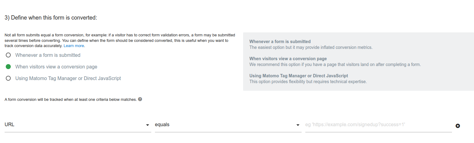 When visitors view a conversion page: We recommend this option if you have a page that visitors land on after completing a form, such as a thank-you page. As soon as a visitor visits a page that matches at least one of the criteria, the form will be converted.