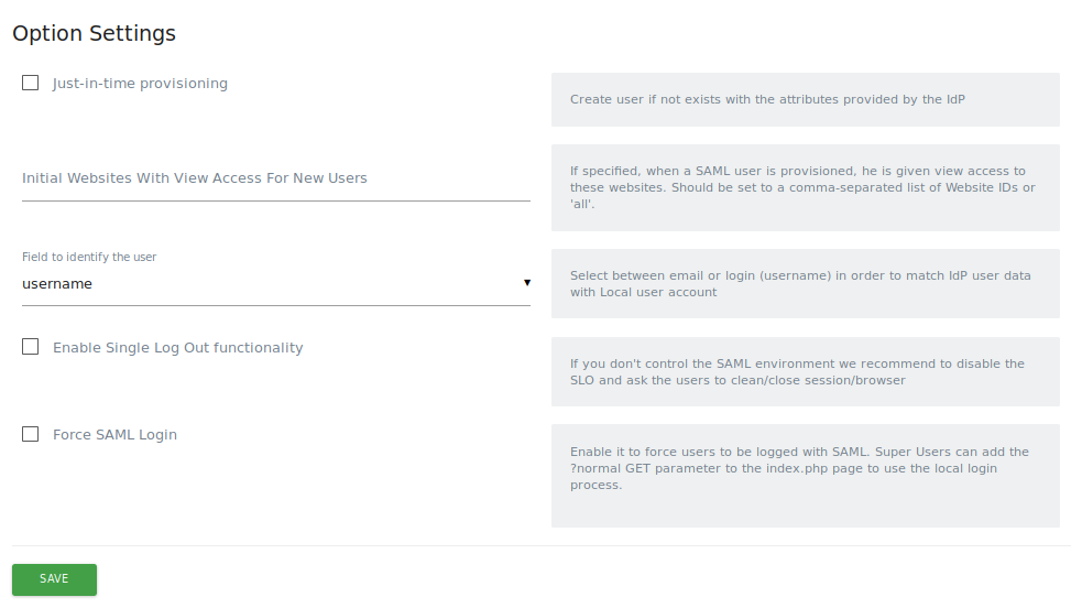 In Option settings section, define how the Matomo SAML integration will act.