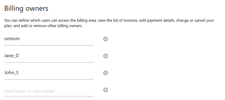 - To remove a user as a Billing Owner, click the minus button next to the user’s name.