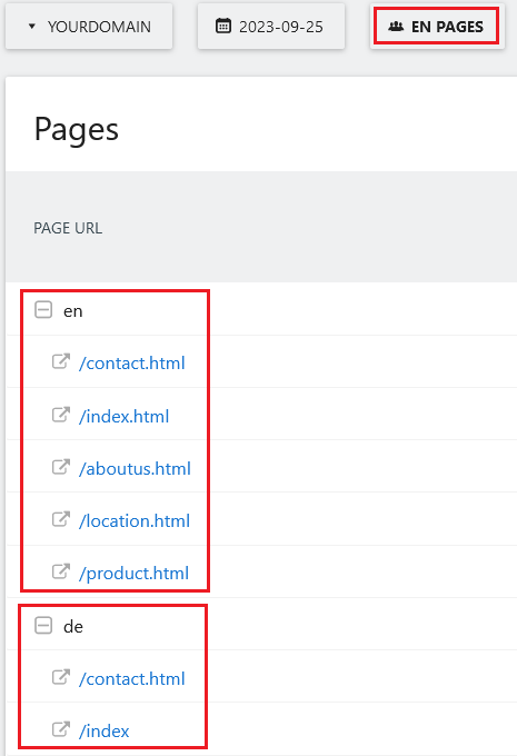 If a visitor starts their visit at yourdomain.com/de and then navigates to yourdomain.com/en during the same visit, this visit will be included in the data for your yourdomain.com/en segment. Even though the visit started on a URL outside the segment, it’s included because the specified URL condition was met during the visit. As we can see in the Pages report below, pages for both yourdomain.com/en and yourdomain.com/de are included.
