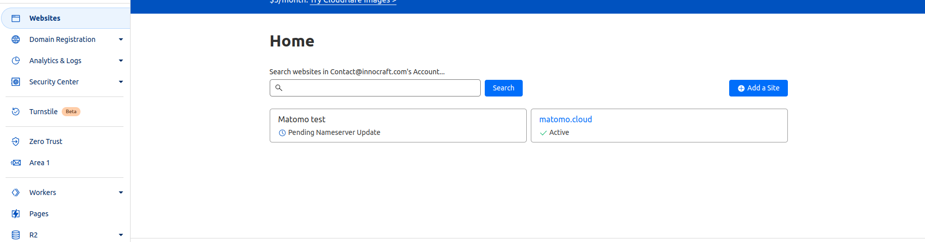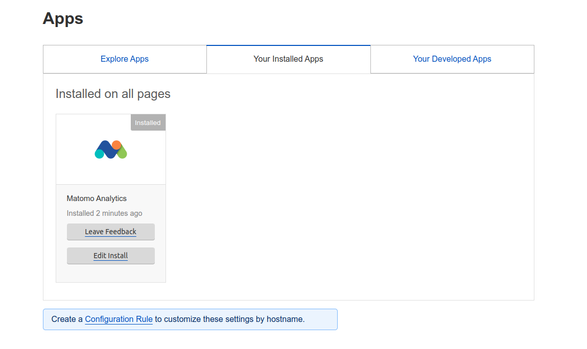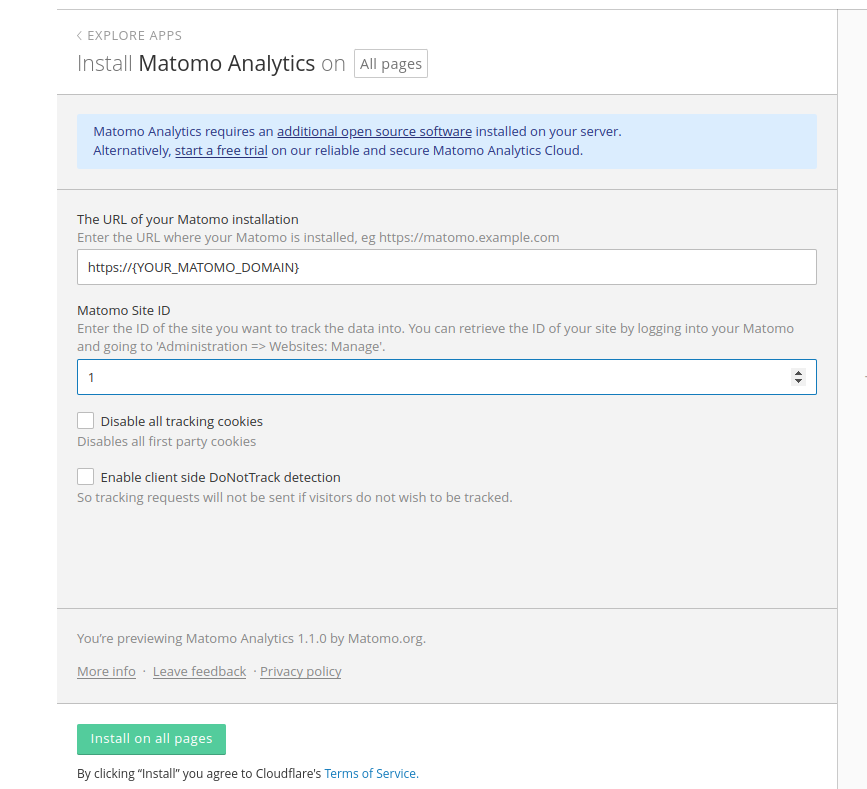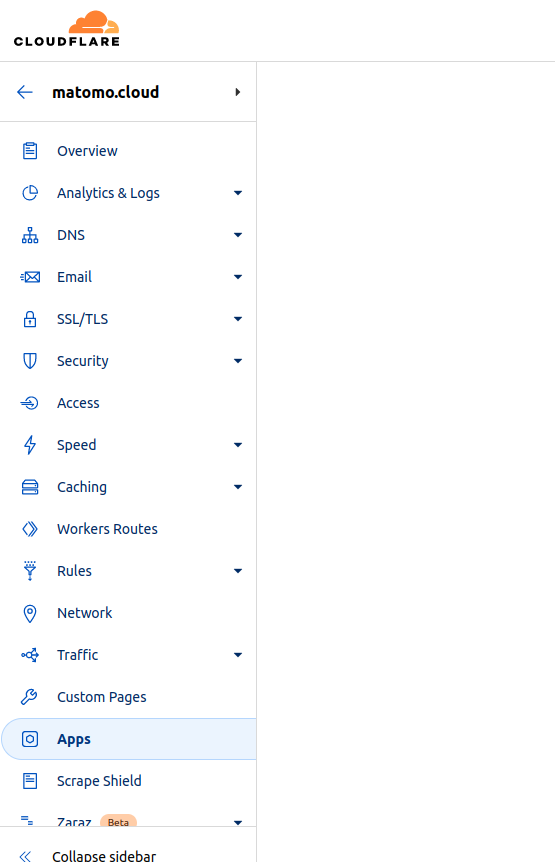Si vous utilisez Cloudflare, vous pouvez commencer à suivre les données dans Matomo de manière transparente en utilisant l’application Matomo disponible sur Cloudflare. Voici comment l’installer :