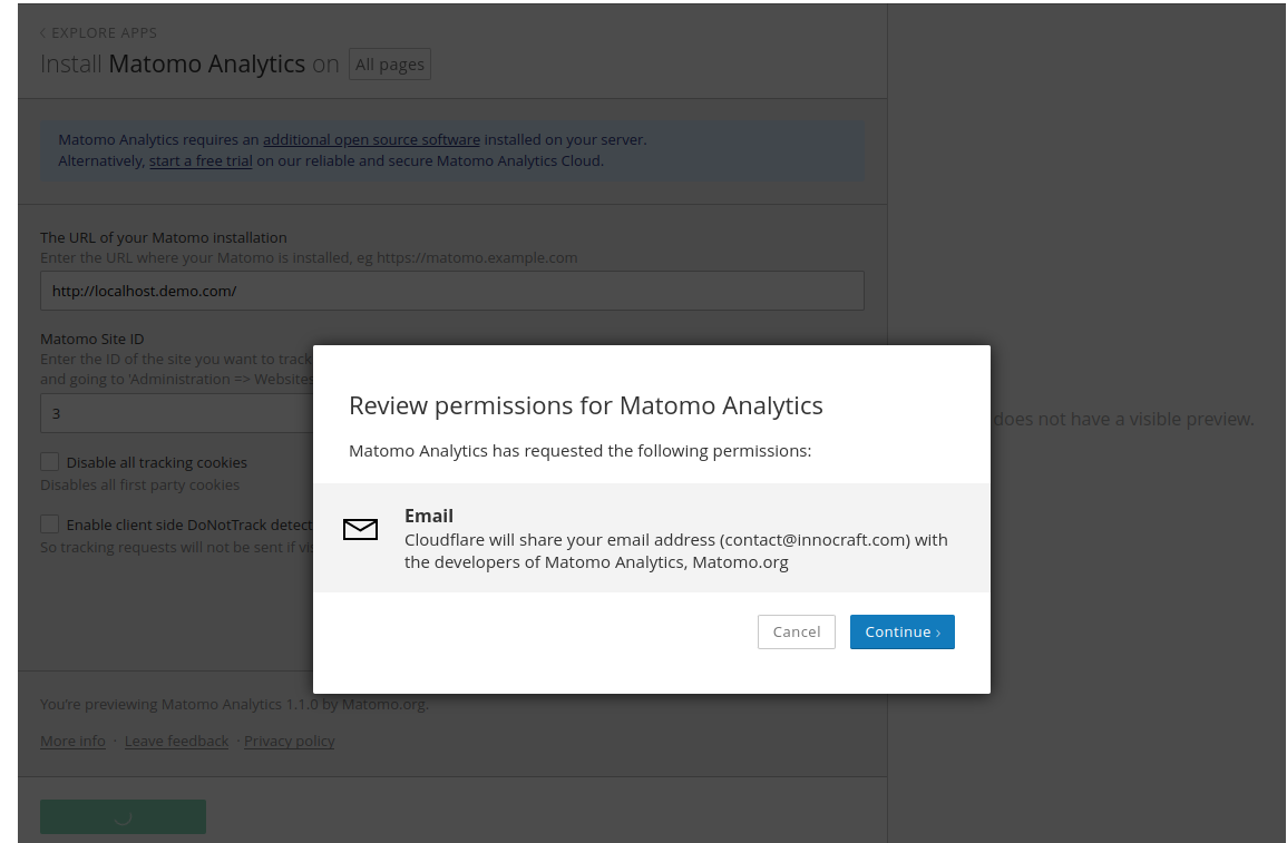 Vérifiez les autorisations et autorisez Cloudflare à partager votre adresse e-mail avec Matomo en cliquant sur « Poursuivre ».