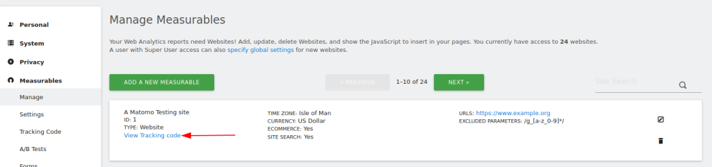 1. Dans votre instance Matomo, copiez le code de suivi. Vous trouverez votre code de suivi dans Administration > Indicateurs de mesure/Sites Web > Gérer > Voir le code de suivi