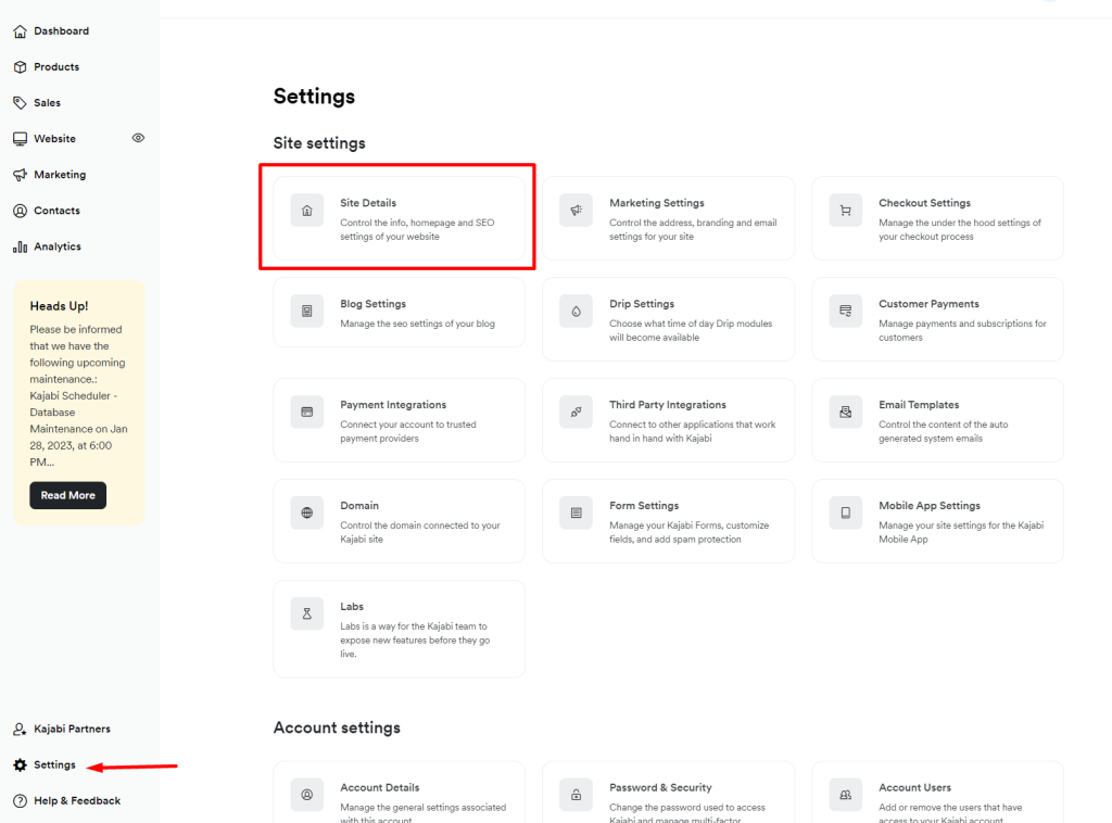2. Connectez-vous à votre compte Kajabi et allez dans Paramètres, cliquez sur Détails du site