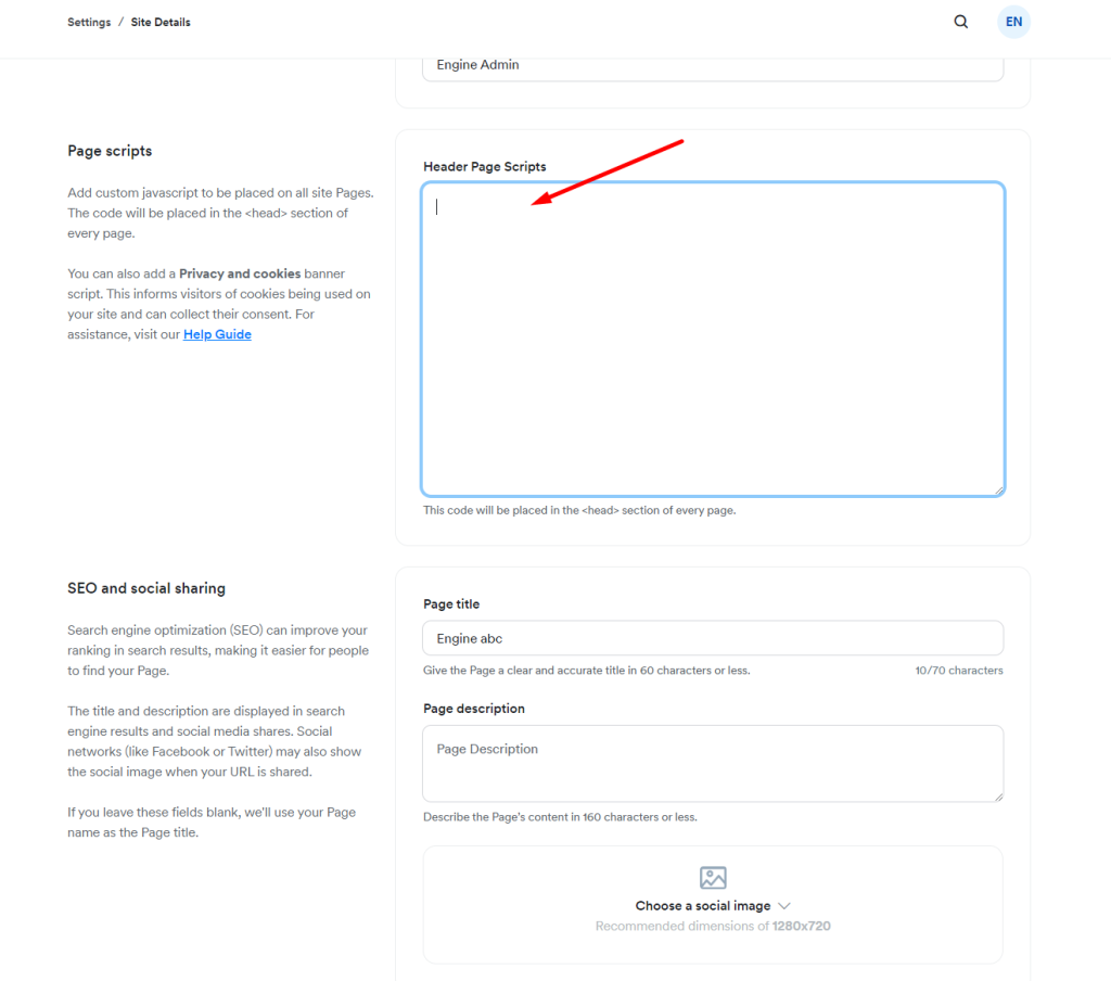 3. Faites défiler un peu vers le bas et collez le code de suivi dans les Scripts de page