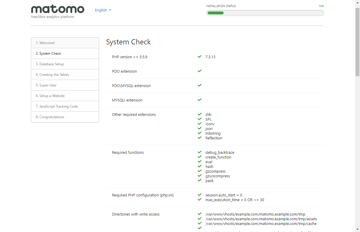 Once the files have been uploaded or unzipped, browse to your subdomain or folder containing the installation. This could be https://analytics.example.com in this example, or https://example.com/matomo if you have installed Matomo in a folder.