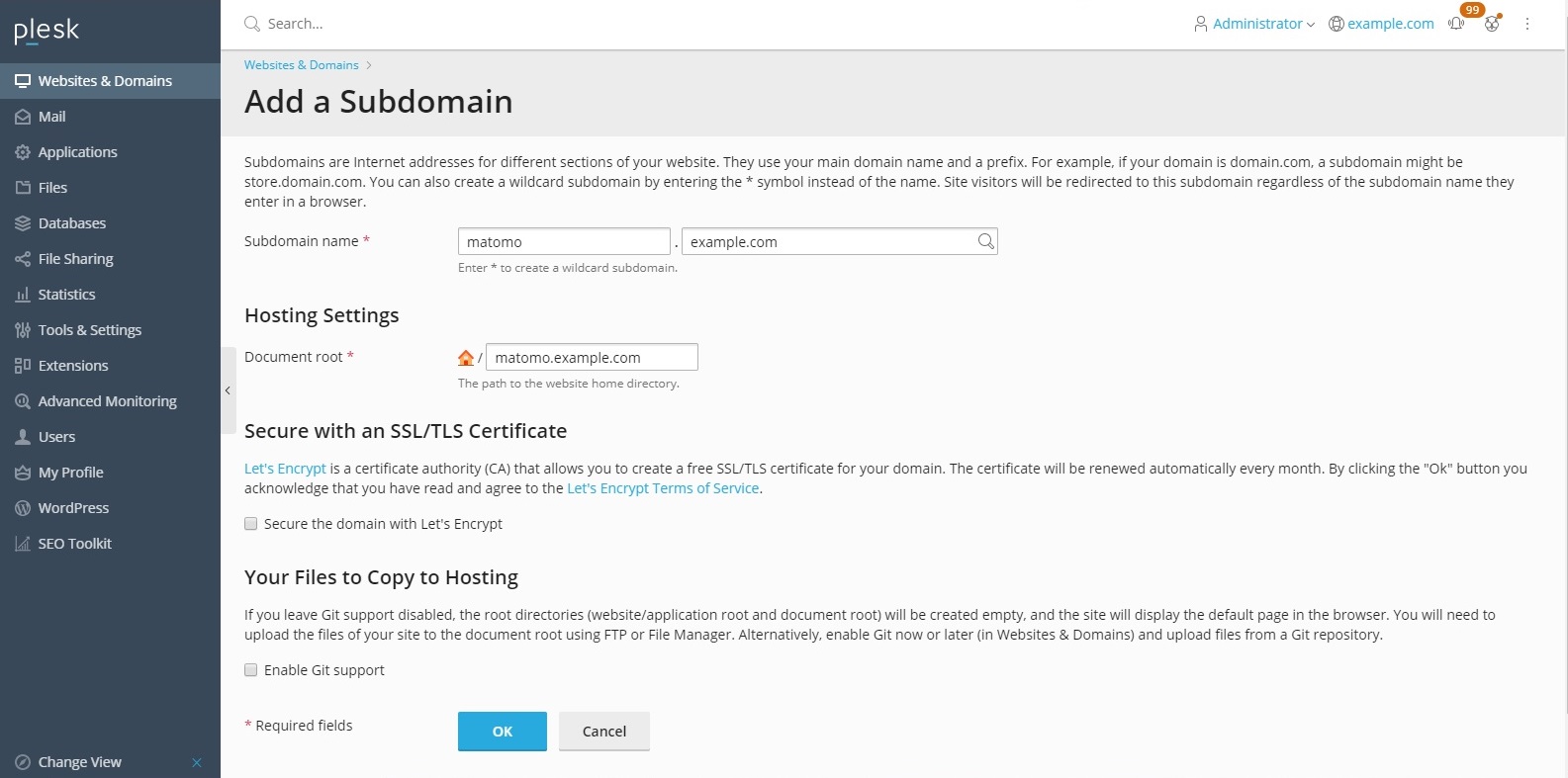 In this case we will create matomo.example.com. If you do not want to create a subdomain simply create a directory within your website. -