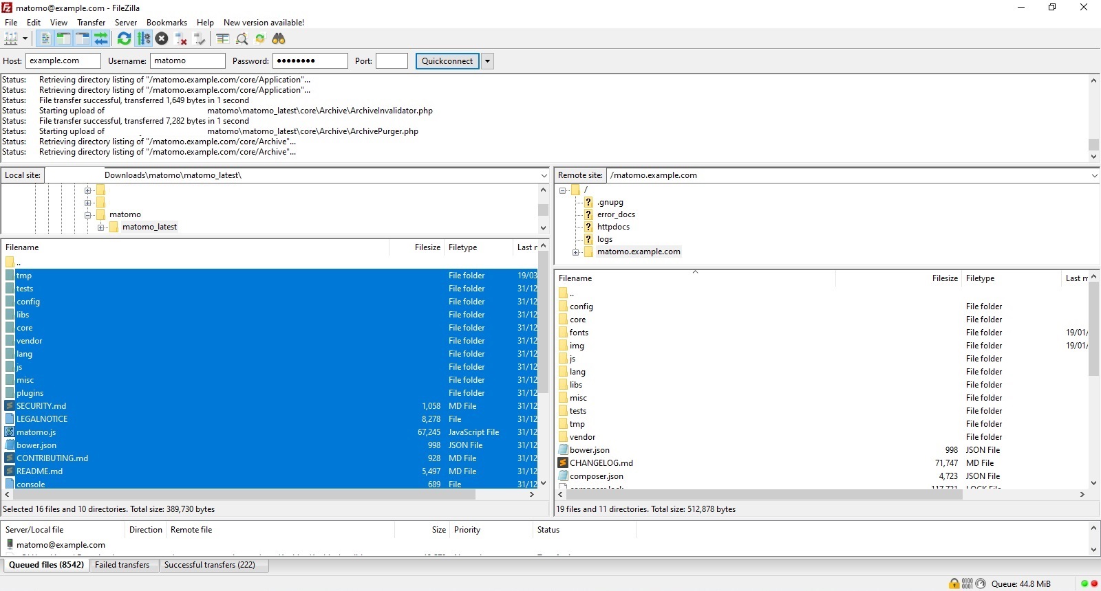 a. Using a tool like FileZilla upload the unzipped Matomo download into the subdomain or folder you have created. This method can take a long time to upload all the Matomo files.