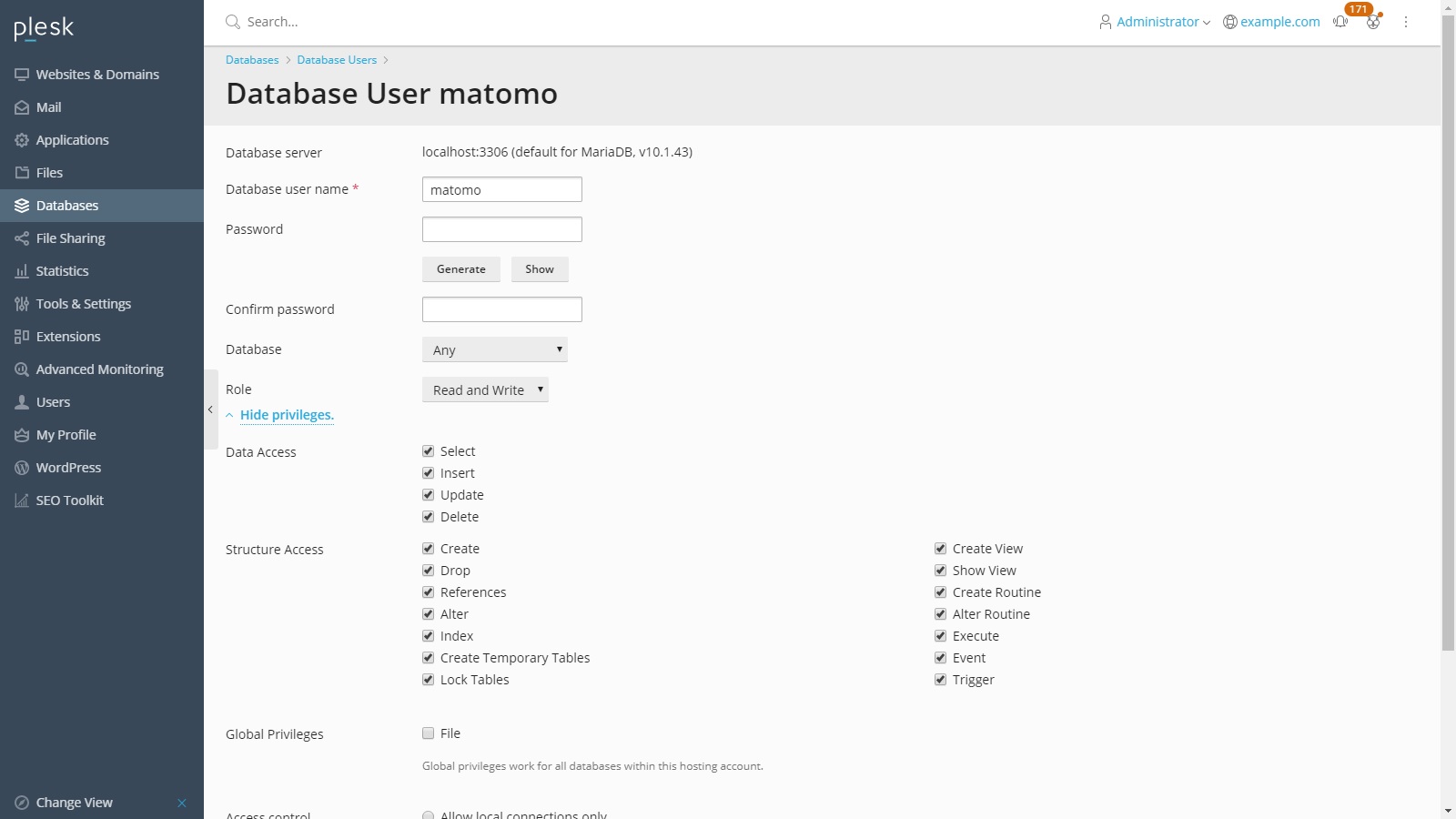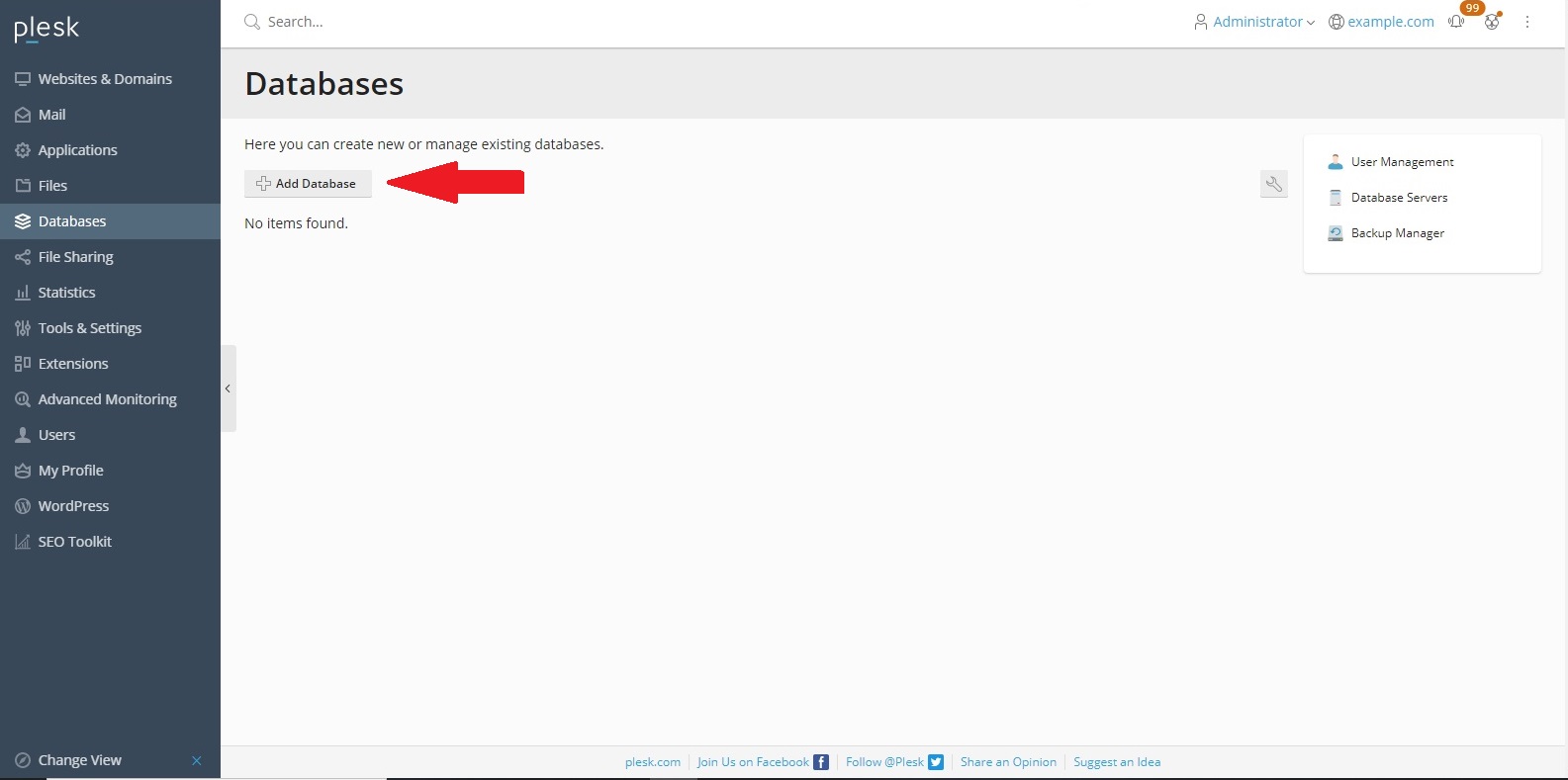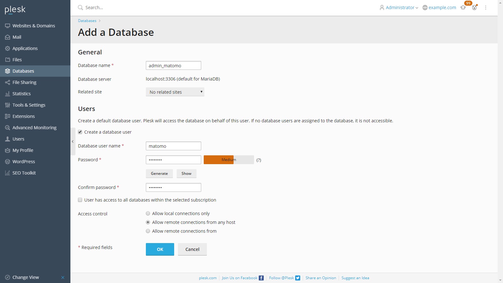 If all the requirements have been met, the next step is to create the Matomo database user and database. In Plesk, choose Databases from the left navigation menu. Then select Add database.