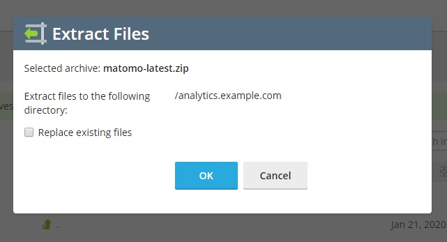 Click Ok to unzip Matomo. This can take some time depending on the performance of your web server. -