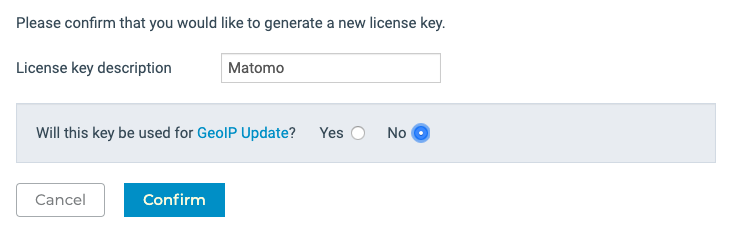 - Enter a license key description, for example « Matomo », and choose « No » for « Will this key be used for GeoIP Update? »