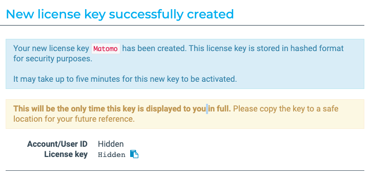 - This license key will be only visible once so it’s best to copy it and save it somewhere secure, or use it in your Matomo right away. If you ever delete this license key, you will need to change the license key in Matomo.