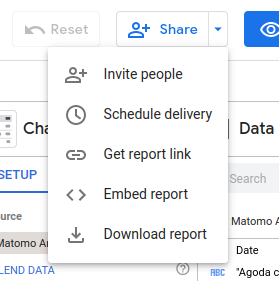 When using the Matomo Connector for Looker Studio, it is possible to share the reports with anyone through a variety of methods. Simply click the Share button at the top right of the screen to reveal the sharing options: