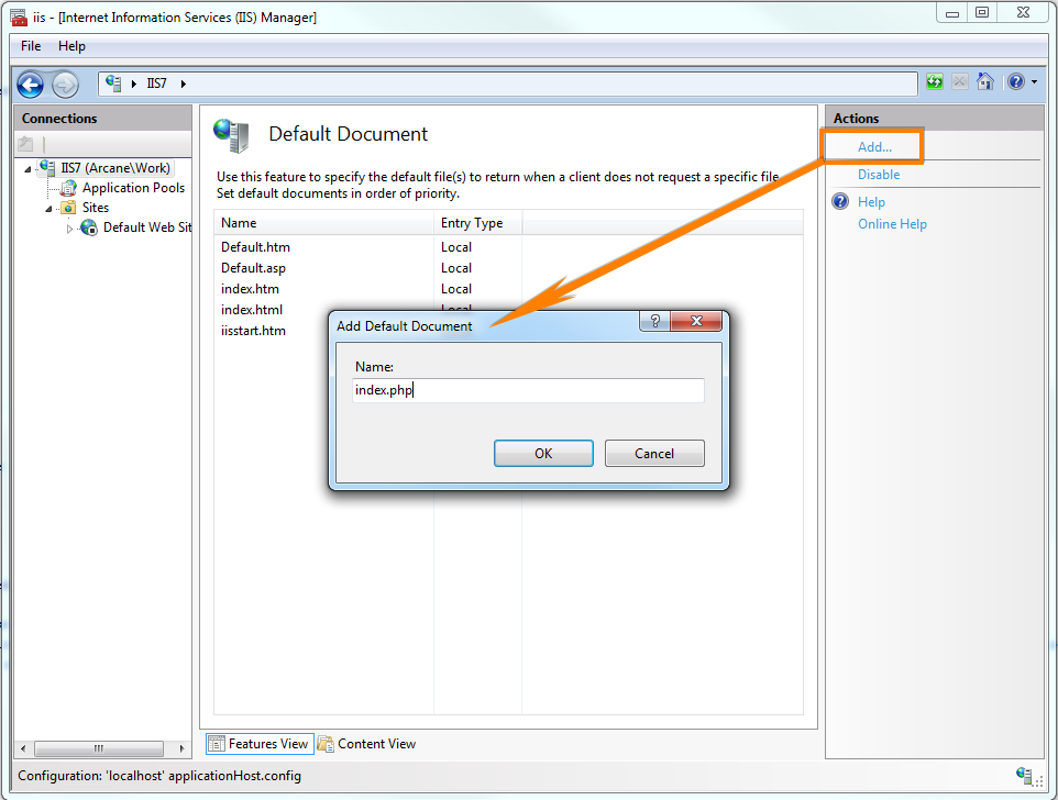 Select and open Default Document at the server level: