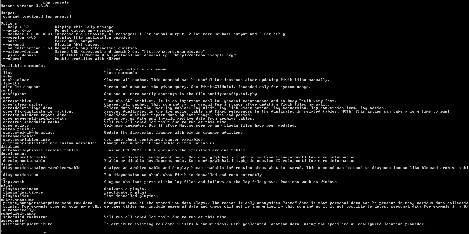 Next, open a command, and run the Matomo console to check it is working as expected: