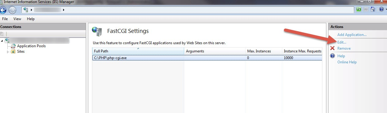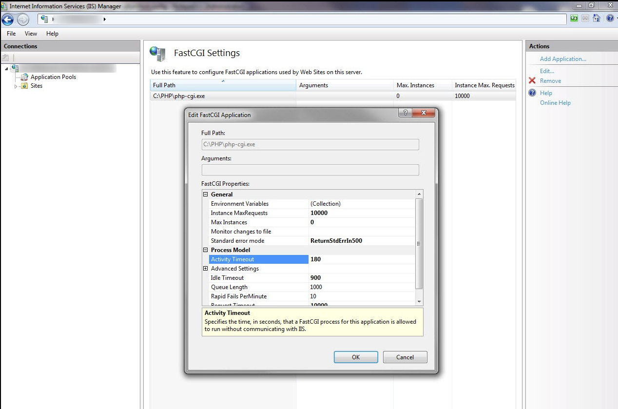 Next we need to change the configured activityTimeout in the IIS Manager under the server/IIS/FastCGI Settings/Edit to a higher value than what is set to by default.