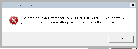 If you get the following error screen when trying to run php, download and install the Visual C++ Redistributable for Visual Studio 2015 from the following link: https://www.microsoft.com/en-us/download/details.aspx?id=48145.