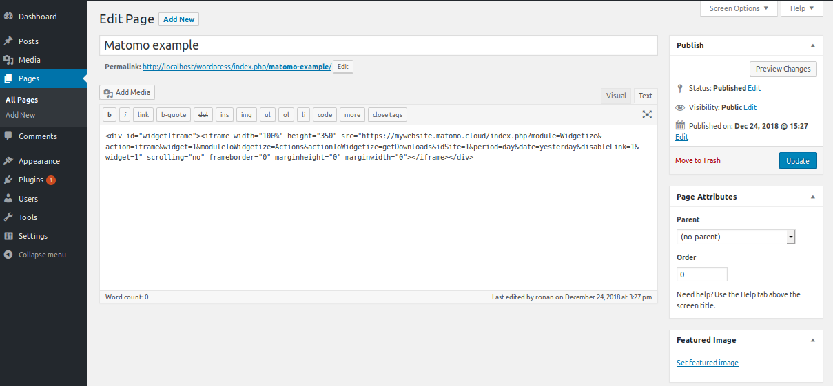 When you have chosen a widget to embed and copied its code, just go to the website in which you wish to insert it, and paste the code where you want it. In the below image, the top downloads report is inserted into a page of its own in a WordPress CMS.