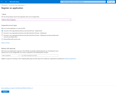 Set the name of app, for example « Matomo Teams Integration » and click Register.