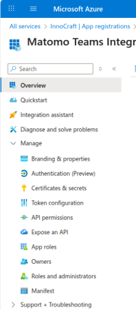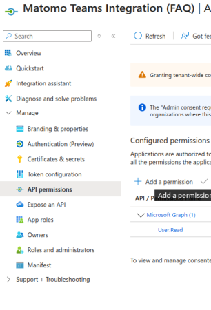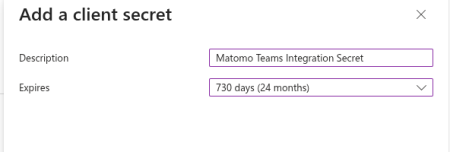 Click New client secret and provide a description, for example « Matomo Teams Integration Secret ». Set the expires to 730 days (24 months) and click Add. Copy and store the Secret Value.
