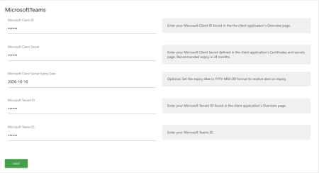 > System > General settings > Microsoft Teams. - Enter the Client ID, Client Secret, Tenant ID and Teams ID obtained from Step 1 & 2 in the fields provided.