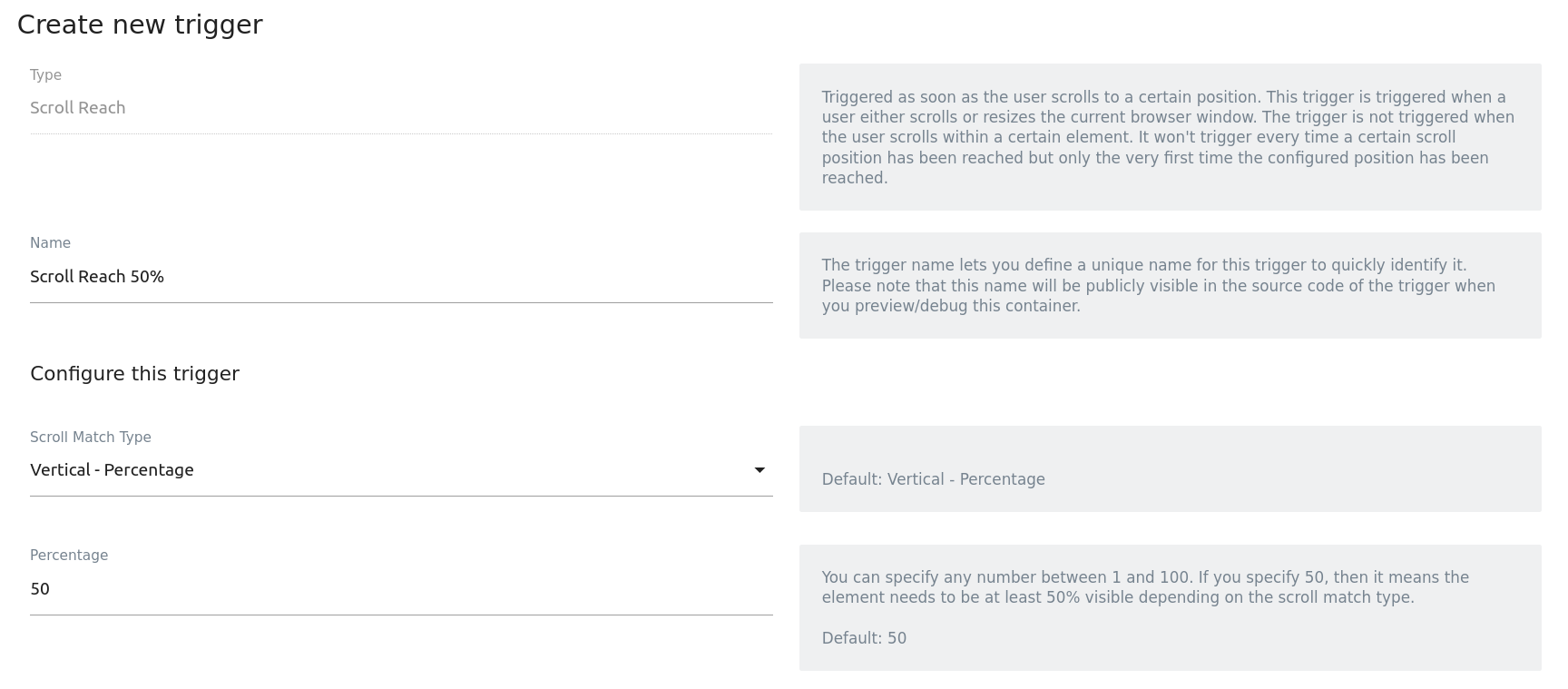 Rename the Trigger to your desired Scroll Percentage (50% in this example), set the Scroll Match Type to the type of scroll you want it to trigger at(Vertical in this example) and change the Percentage to the percentage you want this tag to fire at: