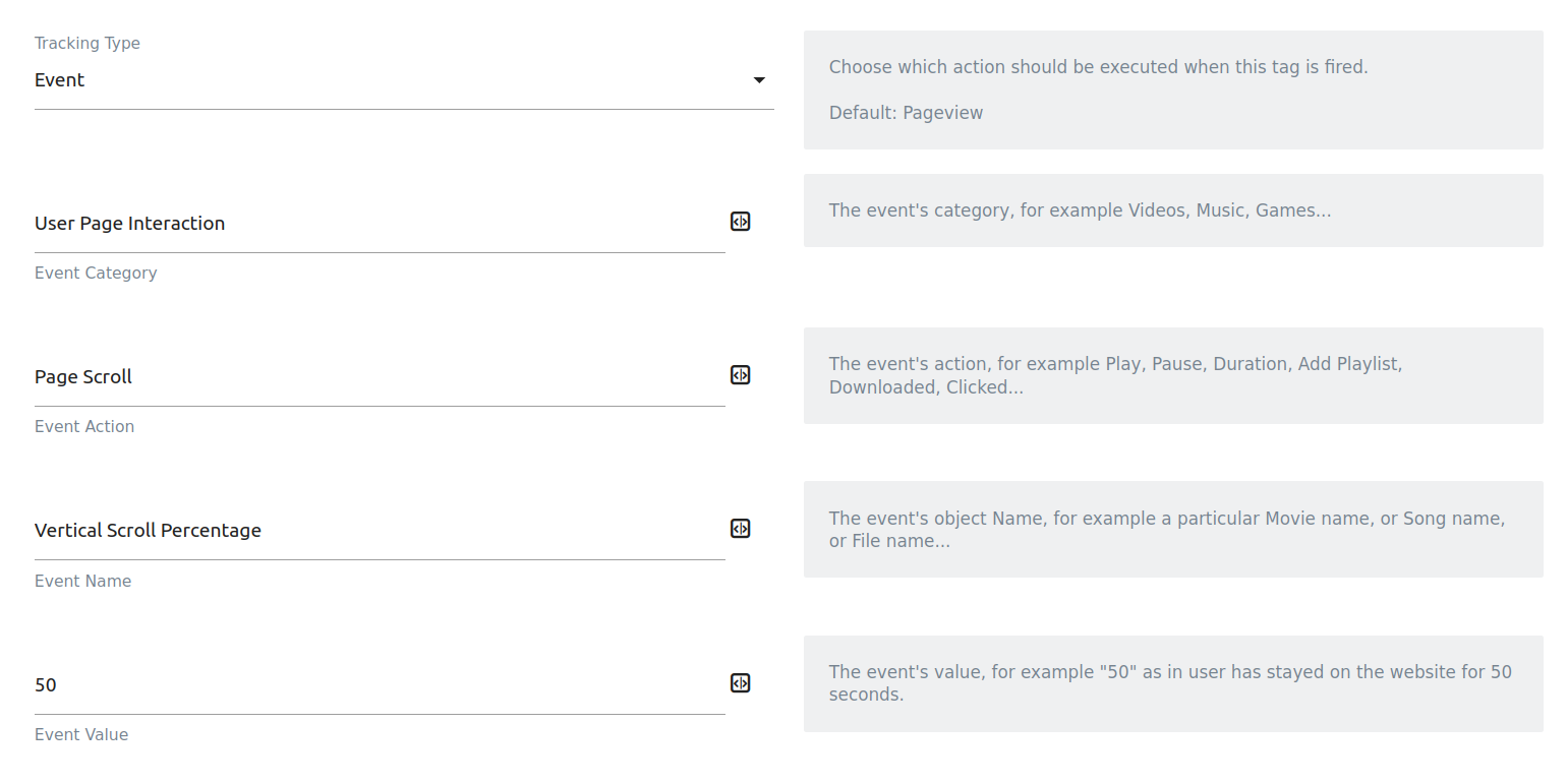 Select the Tracking Type as Event with the Event Categories, Action and Name with your chosen values (For example using 50 for 50% vertical scroll depth):