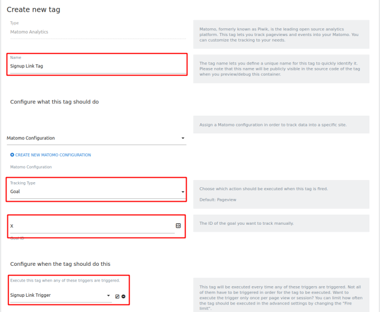 Goal ID: The Goal ID. - Configure the tag the Execute when the « Signup Link Trigger » is triggered