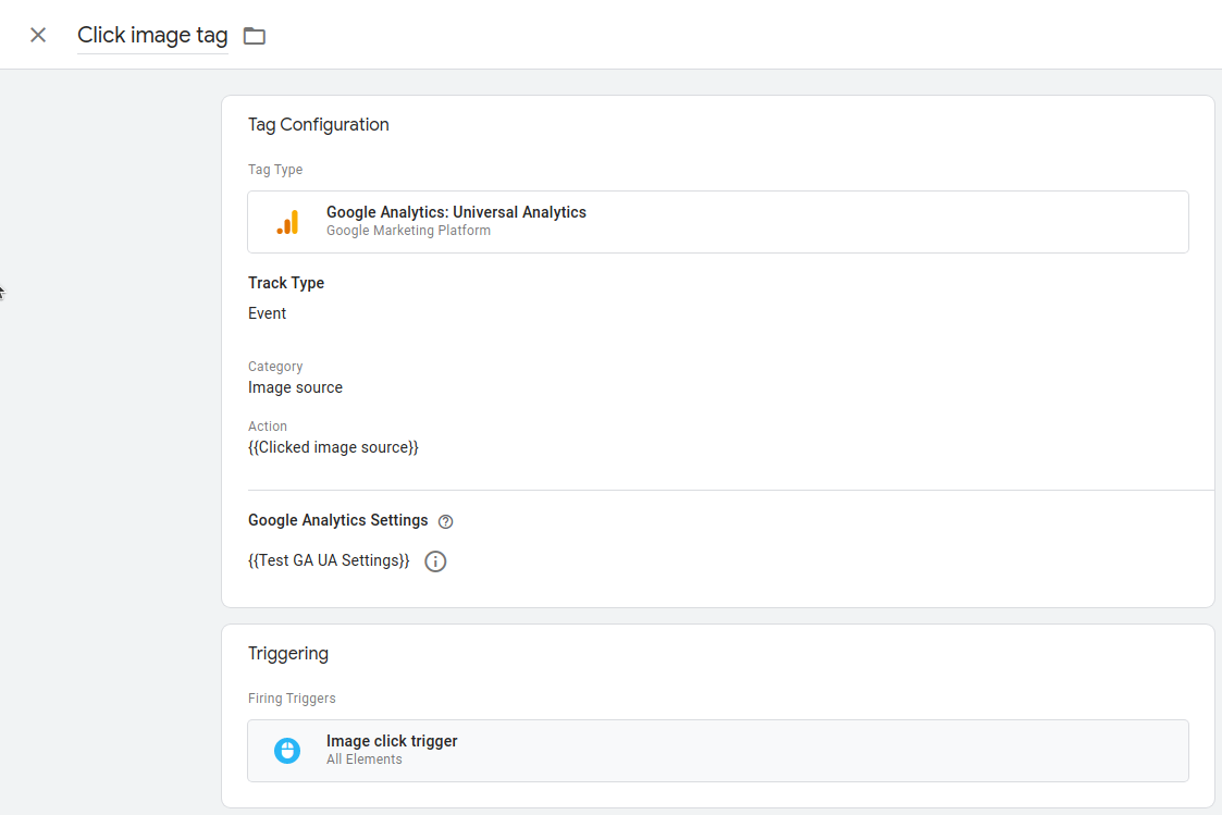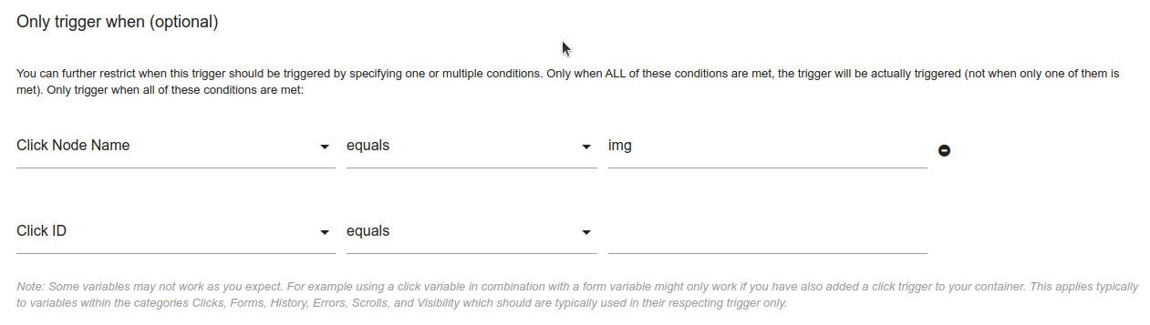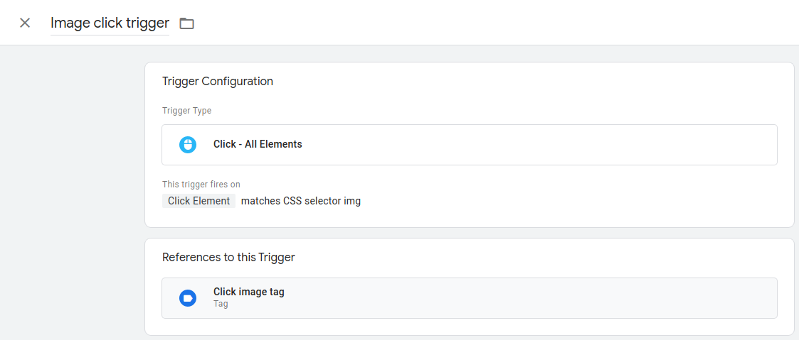 Maybe you have a GTM tag that tracks the source URL of any image that’s clicked on the site. You first have a trigger for image clicks something like this: