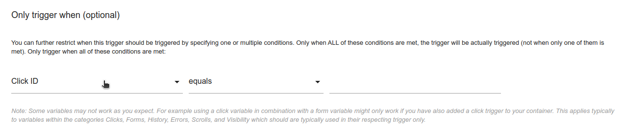 In the Only trigger when (optional) section, click on the select to choose the variable to restrict by:
