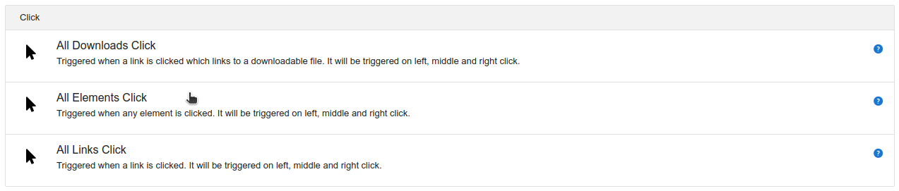 You will be prompted for the trigger type. Select the All Elements Click type: