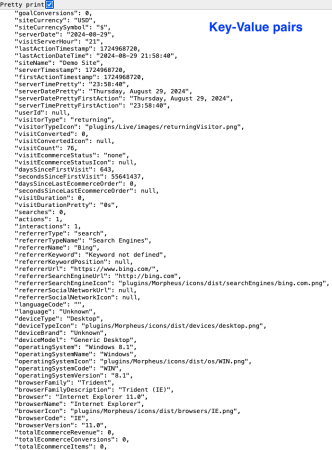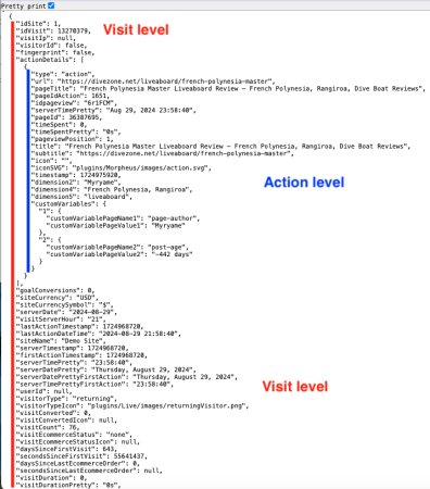 You’ll observe details of visit ID 13270379 for Demo site ID 1 on 29 August 2024. The data returned is in JSON format, though it can also be exported in XML or CSV (TSV) formats. To read the JSON properly, ensure the « Pretty print » option in the top left corner of your browser is enabled.