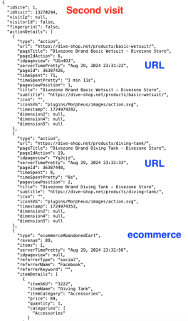 Further down, at the visit level, you’ll see entries like « visitorType »: « returning », « deviceType »: « Desktop », « totalEcommerceRevenue »: 0. It’s useful to become familiar with which key-value pairs belong to the visit or action level: