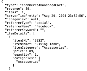 This visit includes multiple page views, outlinks, an event, and an e-commerce entry. Looking closely at the e-commerce entry, the « type »: « ecommerceAbandonedCart » indicates that an item was left in the cart, valued at 89. The visitor came from Facebook, and the « itemDetails » show specifics of the abandoned cart item:
