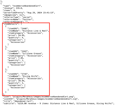 If you search for « type »: « ecommerceAbandonedCart » in the JSON file, you’ll find several e-commerce data entries, each tracking items. For example: