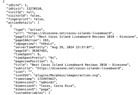 Start by calling the Live.getLastVisitsDetails method found in the Demo setting the day to 2024-09-29, and you will see something like this: