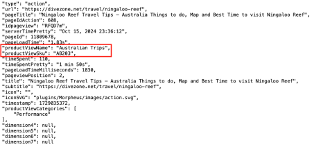 It’s important to note that « type »: « action » can also contain e-commerce data, as seen below. The productViewName and productViewSKU refer to the product details viewed on the page: