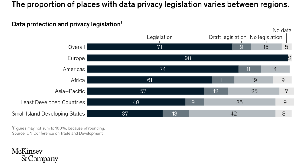 Proportion of countries with enacted data privacy legislation, draft legislation, and no legislation