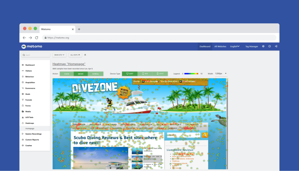 Matomo’s Heatmaps feature records clicks, mouse movements and scrolls to show how visitors interact with a website’s pages. It’s part of Matomo’s visual analytics features, which, combined with Session Recordings, provide comprehensive insights into user interactions.
